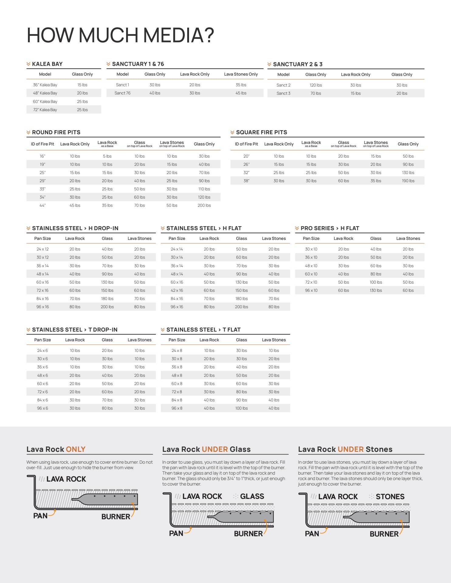 Lava rock can be used as a base layer with another media placed on top or to fill the table/bowl alone. Lava stones should be placed atop a base layer of lava rock in all applications.